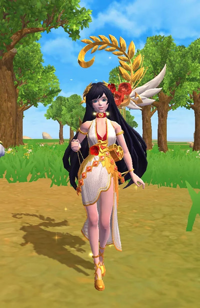 乌黑长发披散及腰,一圈金色橄榄枝环绕成冠做为发饰,优雅的蓝色眼睛充满异域风情,妩媚动人。