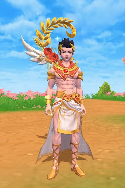 男生同样头戴像征和平与美好的金色橄榄枝,胸部扎系红色布料,造型精美的金饰装饰其上,腰围白金色的宽松布料,裸露出健美的形体,豪放不羁。
