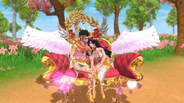 两个金色爱心相依成为靠背,两只巨大的粉色天使羽翼从沙发两侧舒展开来,微微扇动,圣洁美好