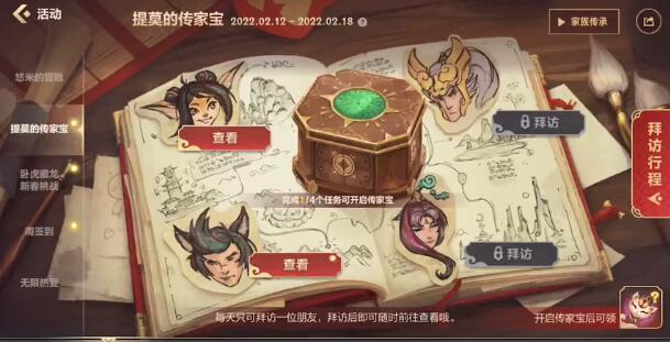 1,活动上线时间:2月12日~2月18日,其中在活动期间,我们只需要去拜访好友,并且完成一些任务,就可以获得提莫的传家宝;