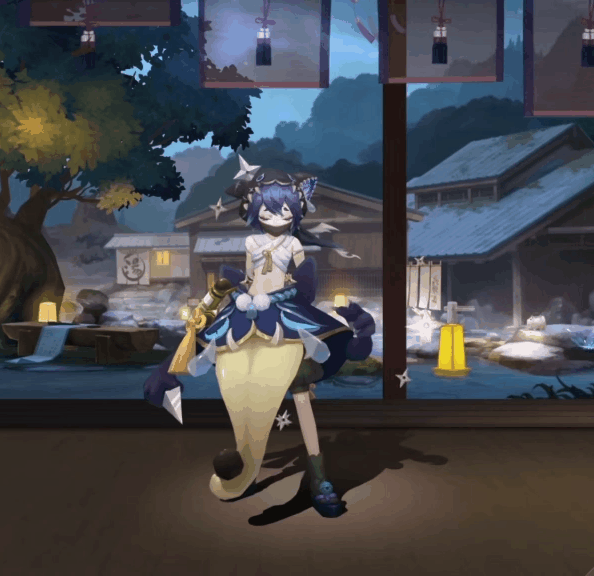 服饰:整体造型上沿用了忍者的造型,以黑色的头巾和蒙面布隐藏面容,轻便贴身的服饰更加方便活动,并加入了猫咪元素增添服饰的萌趣感。