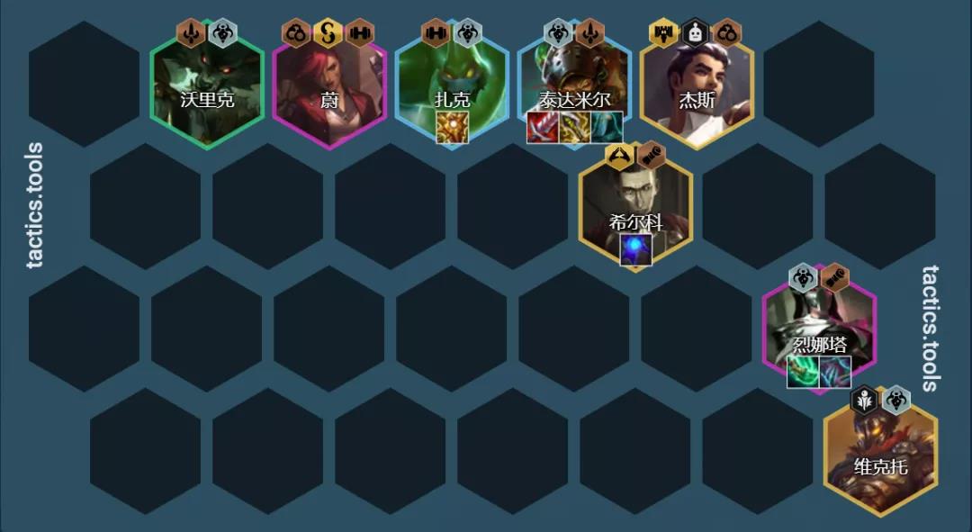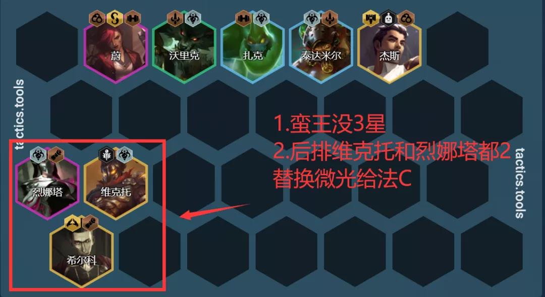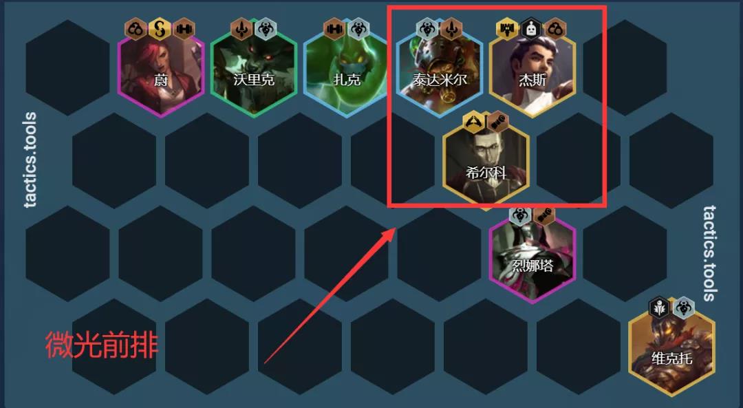 其次希尔科的微光对于前排蛮王+杰斯,后排维克托、烈娜塔都是非常重要的。如果蛮王能够有3星,那么直接给蛮王提供微光,保证蛮王开局直接杀入对面的后排。