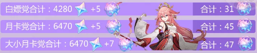 大小月卡党八重池合计:6470原石+7个纠缠之缘(合计47抽纠缠之缘)