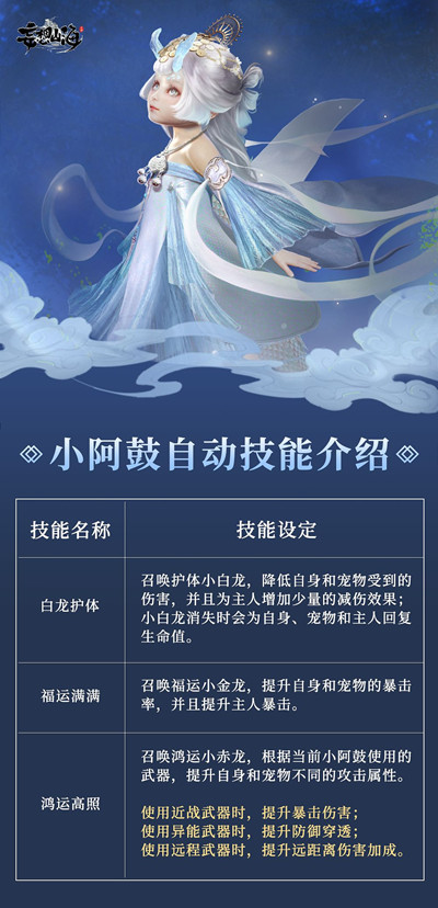 值得注意的是,小阿鼓只有在升阶到甲级以上后才会解锁以上这些战斗技能哦!而在升阶至双甲级之后,小阿鼓还会解锁手动技能盘龙(旅者需要通过轮盘手动释放该技能),释放平时积蓄的力量作为战前准备,在较长一段时间内提高主人和宠物的攻击力,只能在战斗外使用。