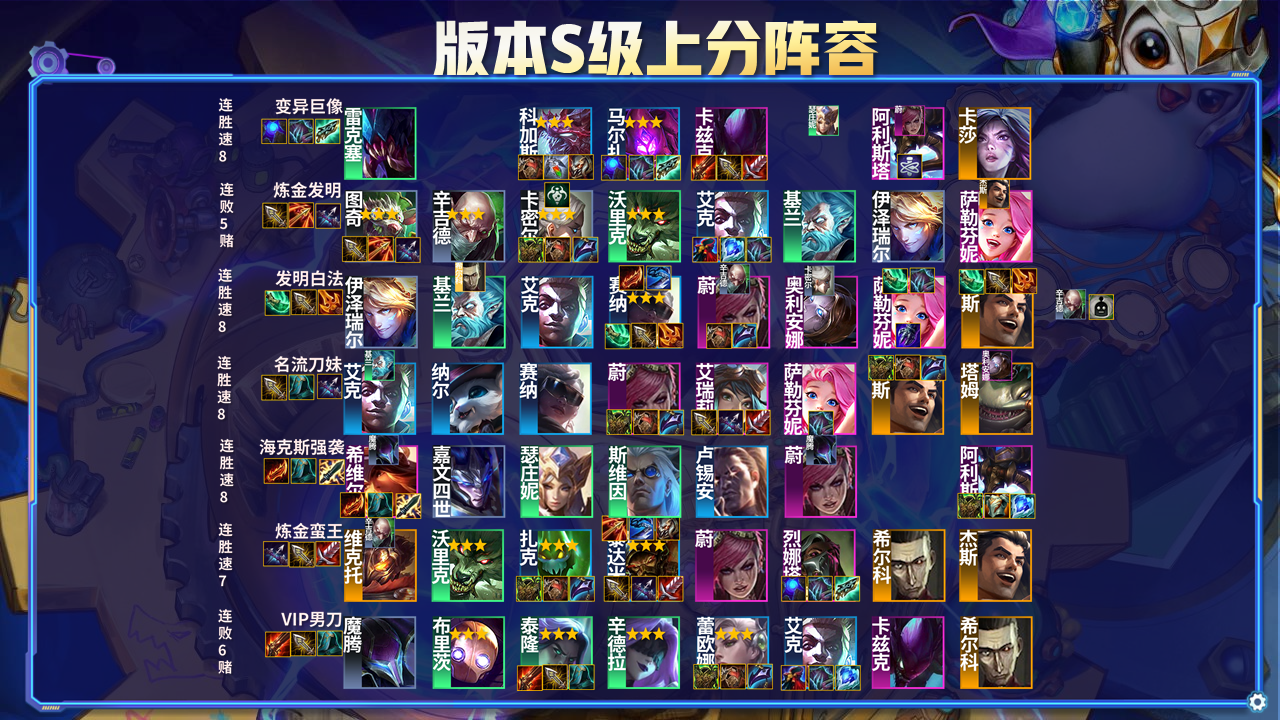那么有些朋友说,我不想烂分,就告诉我什么成型最强就行了,不考虑平均胜率只考虑成型后的强度的话,这几个阵容是最强的,偏三星赌狗或者五费肯定是上限更高,虐菜阶段,喜欢快乐的选他们,高分段看条件玩就可以。