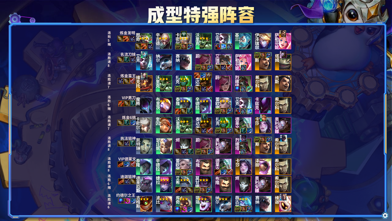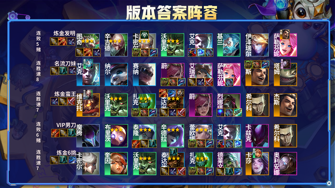 阵容按照从强到弱从上到下排序,大家按照顺序玩阵容即可,老手如果再加上熟悉了测试服各个棋子的极致,对各种费用的手法也很熟悉的话,拿到这张图今天基本上就是神。