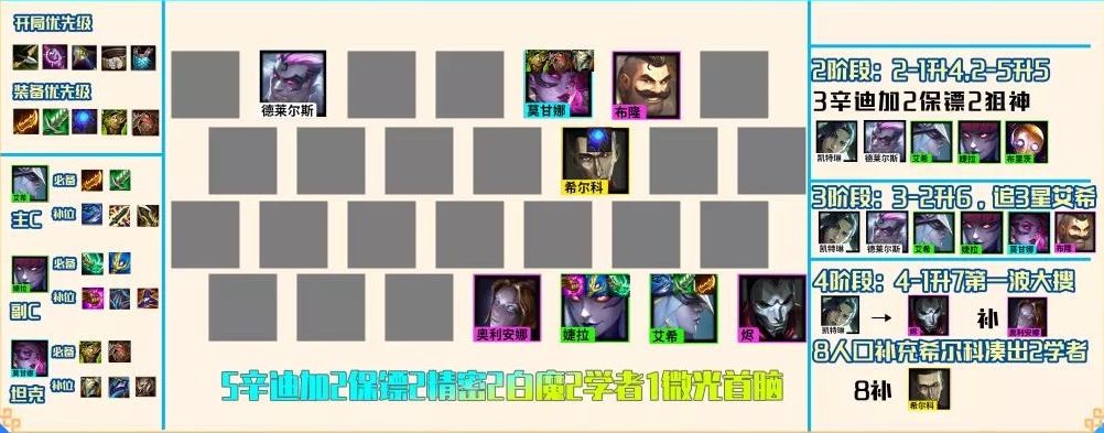 阵容羁绊:5辛迪加2保镖2精密2白魔2学者1微光