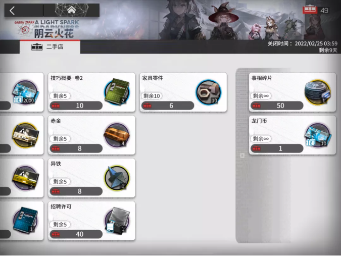 总结一下兑换顺序:事相碎片酮凝集组、模组数据块、高级技能书、龙门币*2000、研磨石、芯片助剂、白马醇、双极纳米片、异铁、中级技能书*2、中级经验书*2、高级经验书、招聘许可、赤金*4。