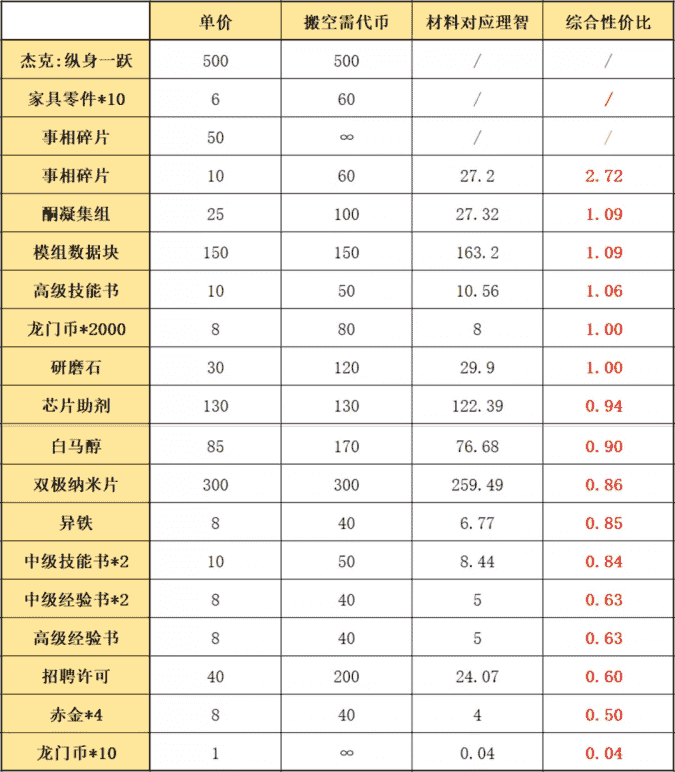 本次活动商店内商品等价分析,等价单位为理智,采用对比理智数值来比较优先级的方式