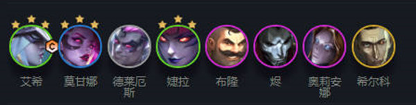 1:阵容由艾希,莫甘娜,诺手,婕拉,布隆,烬,发条,希尔科组成;