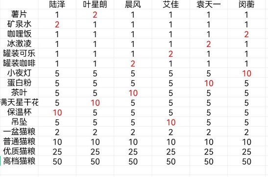 2、表格从上到下:薯片、矿泉水、咖喱饭、冰激凌、罐装可乐、罐装咖啡、小夜灯、蛋白粉、茶叶、满天星干花、保温杯、吊坠、一盆猫粮、普通猫粮、优质猫粮、高档猫粮
