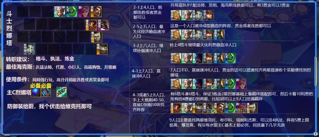 2-1的时候上4人口,阵容要速冲八,所以重点就是稳血到八找烈娜塔,前期的话连胜策略,就选卢登、电荷之类的强势连胜,当然卢登是发明天胡,冲发明最佳,前期斗士和狙神搭配是最好的,伤害高,有执法,还有就是斗士配海克斯加强袭,另外就是斗士配变异,实在不行老鼠的过渡也能用。