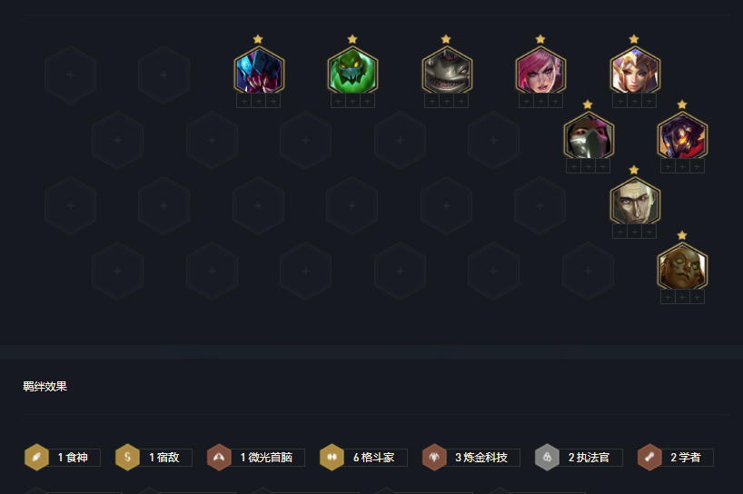 4阶段:3-6或4-1升级7人口,这时候如果没有烈娜塔需要搜一个烈娜塔,如果有烈娜塔直接考虑攒钱,准备4-5升级8人口,7人口蔚可以换下俄洛依,如果白嫖塔姆直接开6斗士,没有则4斗+3炼金+2学者,学者位在希尔科没来之前可挂婕拉或辛德拉。如果在4阶段选择有希尔科、塔姆、维克托就直接将拿下,对阵容提升非常大。