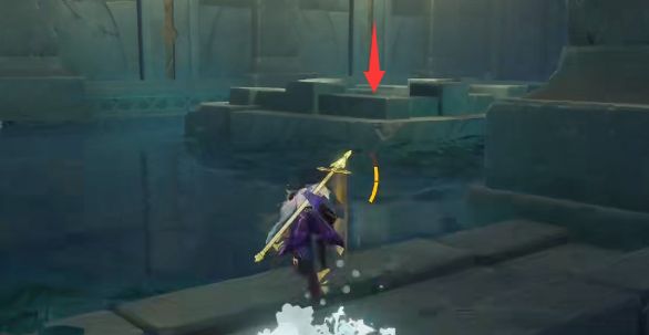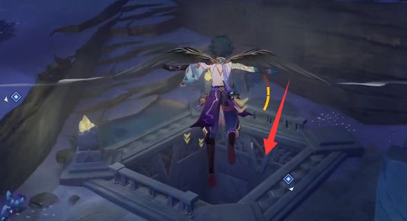 1、在渊下宫锚点平台,来到下图所指的最边上,往箭头方向飞行。