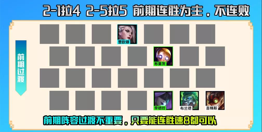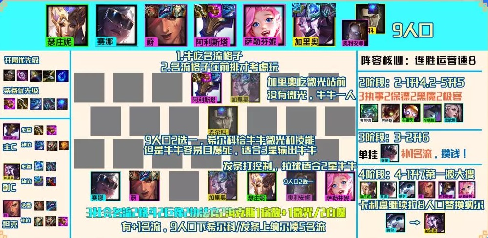 后期阵容:8人口去找2星牛牛和1星加里奥,加里奥主要是开3名流使用,如果没有加里奥可以补充纳尔先开3名流,再搭配希尔科补充微光羁绊,或者发条凑出白魔羁绊都是非常不错的选择。