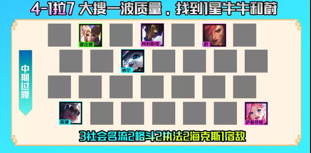 中期阵容:4-1选择小D一下变换阵容,主要是找到1只牛牛和蔚补充2/3社会名流即可,牛牛的装备跟刀妹和螳螂的有些类似,核心装备无尽之刃都是共同的,除了法爆的需求不一样以外,中期可以根据名流圈子的位置转换阵容。