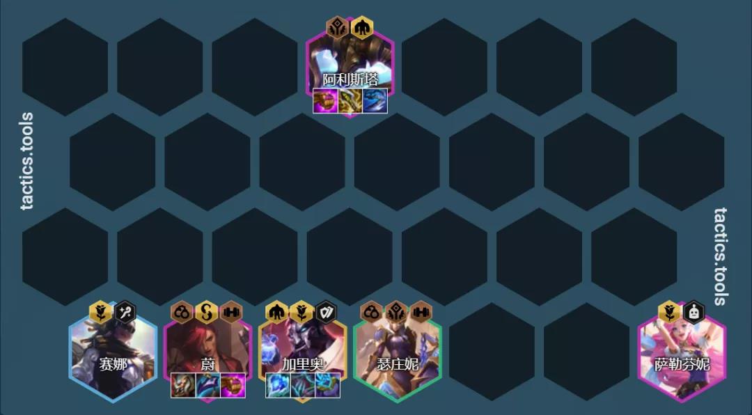 阵容组成:瑟庄妮、赛娜、蔚、牛头、萨勒芬妮、加里奥、发条/希尔科(9人口)