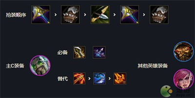 在这个阵容中德莱文是主要输出,无尽和轻语是必备装,德莱文的攻击是从前排开始的,需要有足够强的切肉能力,第三件水银、巨人杀手等都可以。