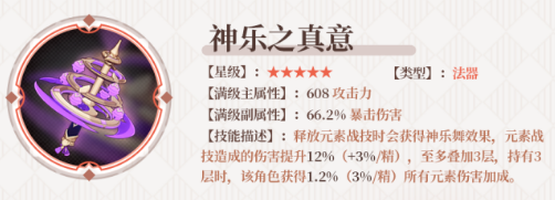 八重神子专用武器,释放元素战技会提升元素战技造成的伤害,叠满3层后还会获得所有元素伤害加成,对于目前的角色来说只有八重最为适合,可莉能用但其他角色都不太适合,神子队伍这把武器的依赖性也是非常强的,如果想抽这个武器务必要去抽神子,不然这个武器可能就要在仓库里放着没人用了。