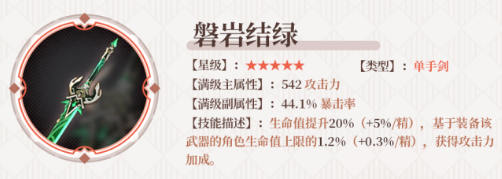 上限很高的一把武器,单手剑非主流主C可以使用,增加生命值再基于生命值提升攻击力,44.1%的暴击率可以傲视群雄,攻击力可以用副C的增益来增加,暴击可是实打实的暴击率,对于主C刻晴副C琴伤害增加都是立竿见影,最初也有肉刻晴这一说法非常耐揍,只要是抽到肯定能找到人用,有条件可以抽一把放在库存以后配装绝对用得上。