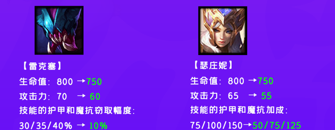 雷克塞:大削弱,生命值、攻击力与技能3方面均遭砍,雷克塞棋子定位就属于输出坦,这次攻击力削弱,输出能力下降,攻击力还与技能联动技能伤害下降;生命值与技能窃取双抗降低,坦度与肉度均下降,雷克塞整体强度下降较为严重,这次更多是在针对3变异阵容不给装备的雷克塞在3变异中无装备肉度较高,这次更新变异阵容强度略有下降。