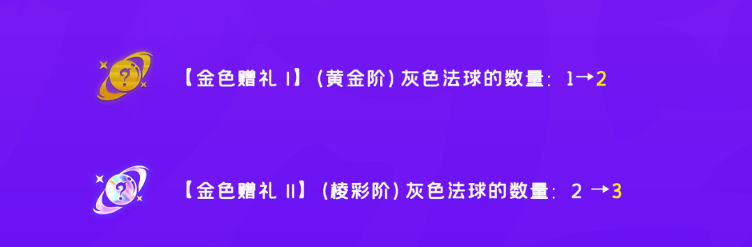 金色赠礼:金色与彩色海克斯均小加强,灰色法球大概率金币小概率是装备,增加一个法球收益会更高,彩色羁绊增加幅度不大,与其他强势的彩色海克斯相比提升不大,但金色提升较大,2个灰色更容易出现装备与金币收益,特别是在前中期对经济运营提升较大。