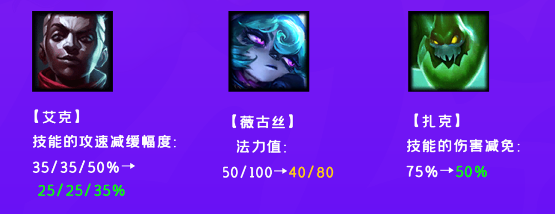 艾克:削弱,技能降低敌方攻速全等级削弱,控制能力下降,但由于不论在刺客阵容还是发明家与极客阵容中艾克通常会携带冰心,效果与Debuff略有重叠,削弱力度不大,但对版本较为热门的发明家与刺客阵容强度略有影响。