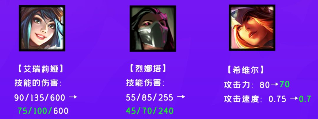 希维尔:大砍,攻击力与攻速均削弱,特别是攻击力与攻速均与希维尔的技能可产生联动,削弱幅度较大,加上海克斯技能的大砍,6/8海克斯希维尔阵容强度下降好几个档次。