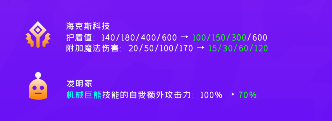 发明家:削弱,【机械巨熊】的额外攻击力削弱,但发明熊在5发明阵容中更多要的是坦度来吸收伤害,和搭配希尔科的自暴,削弱力度有,但削弱不大。
