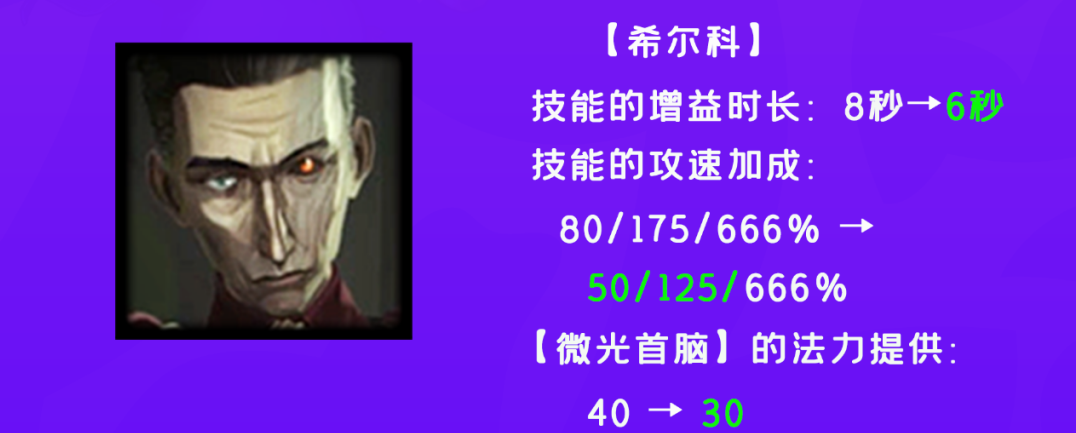 希尔科【微光首脑】的法力提供:40 ⇒ 30,削弱,这个只是对高法力值棋子有影响,但影响幅度不算太多。