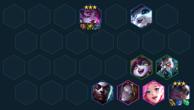 只差一两张了可以多D一些冲出来,双3了火速拉8补璐璐开4白魔阵容即成型。纳尔数量多也可以追,名流格在后排让赛娜踩,前排就让莫甘娜踩,D到杰斯就换璐璐,8人口全场2星及以上就可考虑拉9,9人口上杰斯+EZ可开5发明2极客。总的来说名流赛娜成型强度非常高,很克制现在大火的格斗烈娜塔,唯一比较怕刺客,所以尽可能多观察外面环境临调站位。