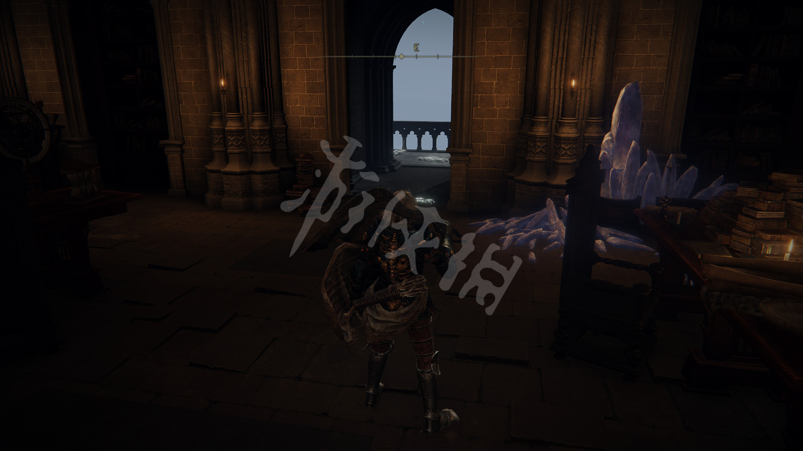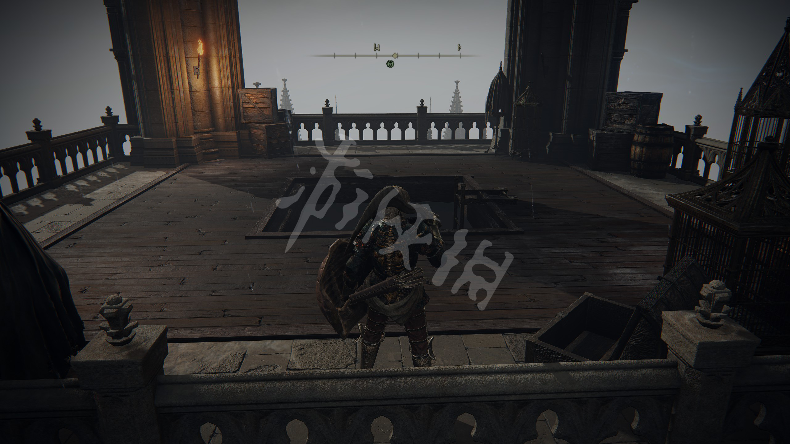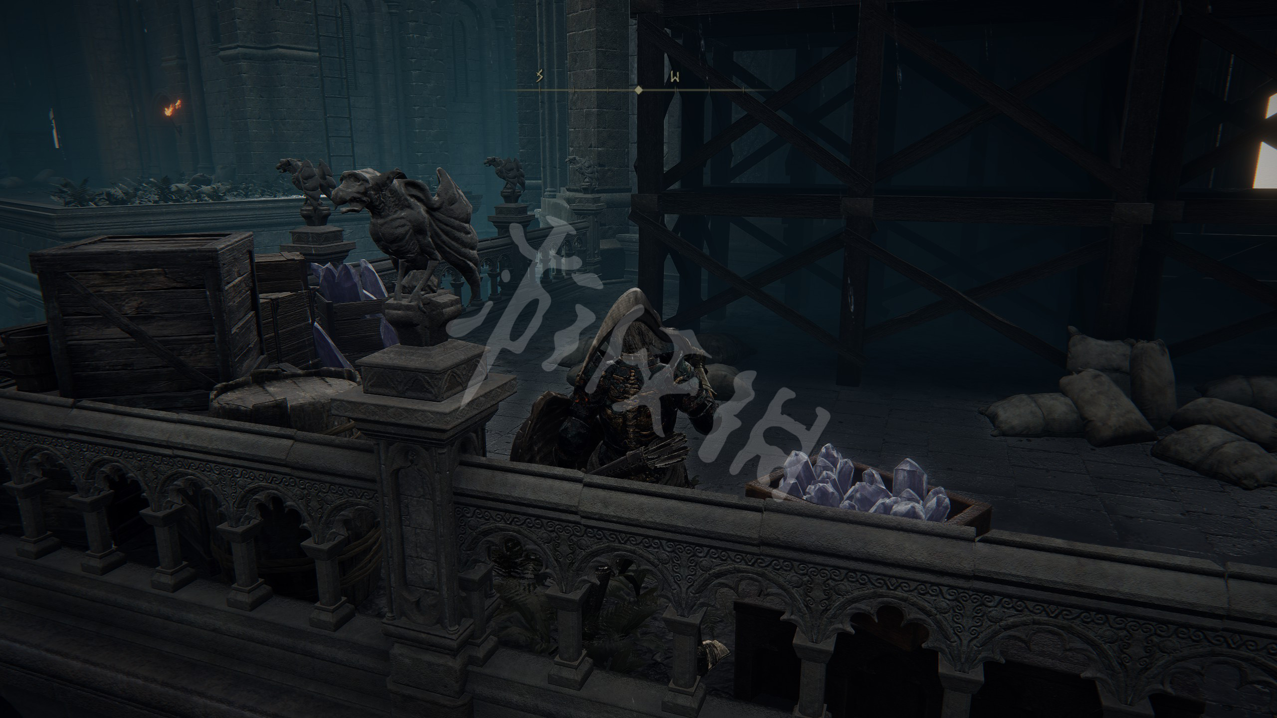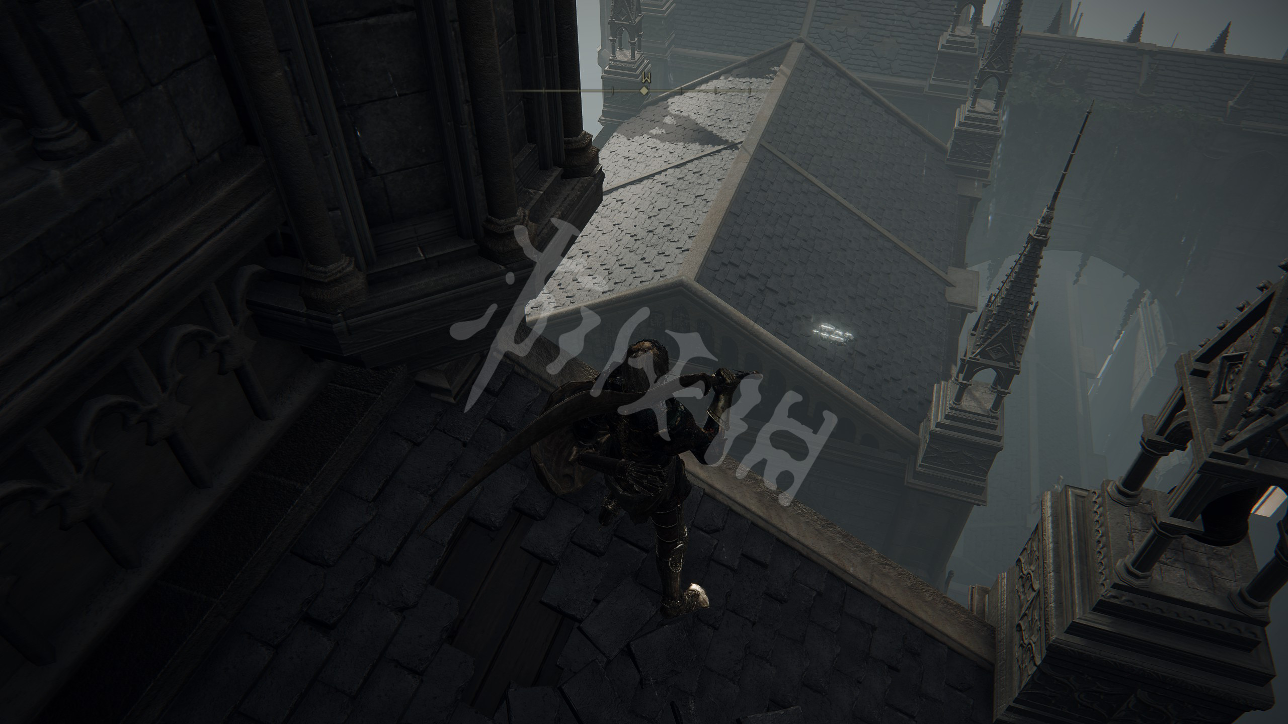 从这里看准木板跳,其中一层会再有结晶蟹,打死再拿到一个头部装备。跳到底后从梯子上去,再跳到对面的教堂屋顶。
