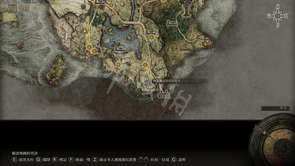 首先boss的位置是在这里,出生地往下走,在通往南部地区的桥旁边山坡上,四周有许多立起来的石头圆球,boss被封印在一个监牢之中