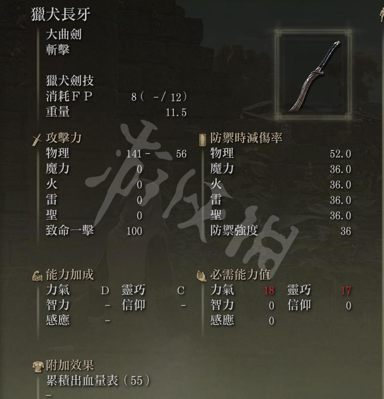 然后BOSS死亡后会掉落猎犬长牙,一把带有出血效果的不错武器。