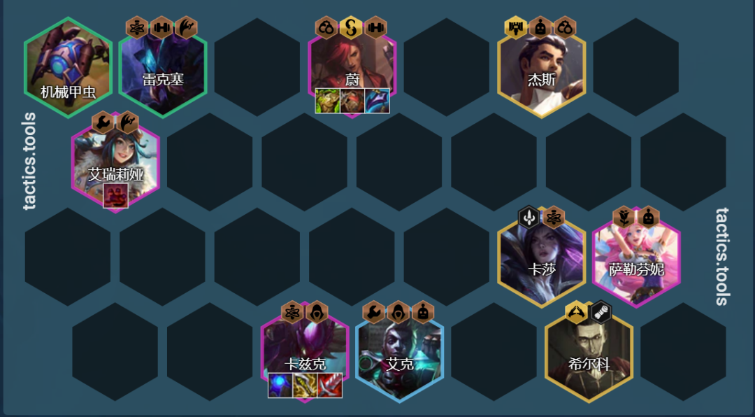 雷克赛、艾克、萨勒芬妮、刀妹、蔚、螳螂、卡莎(可用卡萨丁代替)、杰斯、希尔科(9人口)