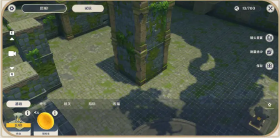 拟想秘境中,布设着各类地形,在这些围墙或陡坡构建出的空间中,分布着冒险币。有些平台可以攀爬,如斜坡、小型平台等;有些平台不可攀爬,如围墙。