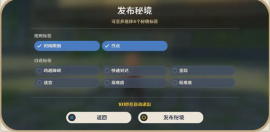 旅行者也可以给自拟秘境选择合适的标签,并将自己拟想的秘境对外发布,但在发布前,旅行者需要自己先完成一次预备发布的拟想秘境。