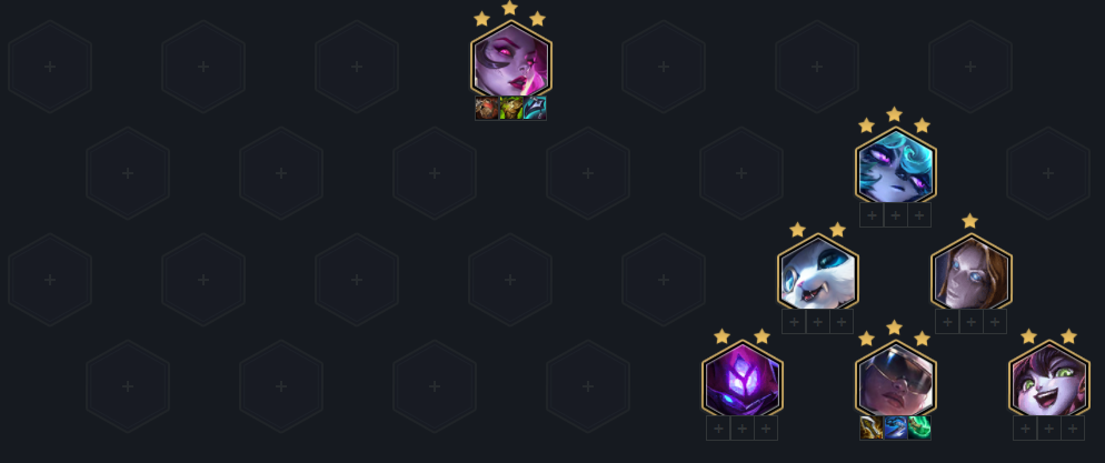 顺利的话莫甘娜、薇古丝和赛娜有两个到三星后直接上八,搜出萨勒芬妮开三名流,名流位在前排就莫甘娜吃,后排则给赛娜吃。之后在八级慢搜阵容整体三星即可,两星维克托可以替换玛尔扎哈,有双重麻烦就多上一只赛娜,如果有转职可以按羁绊开5名流or6白魔都可以。