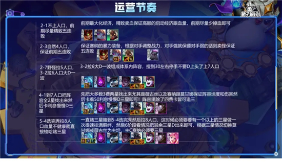 走连败的情况下2-7野怪拉5人口,3-2拉6人口大D一波组成体系内阵容,搜到30左右停手不要D上头了上7人口,走连胜的话就无需D牌直接用利息速冲7人口大搜一波即可!