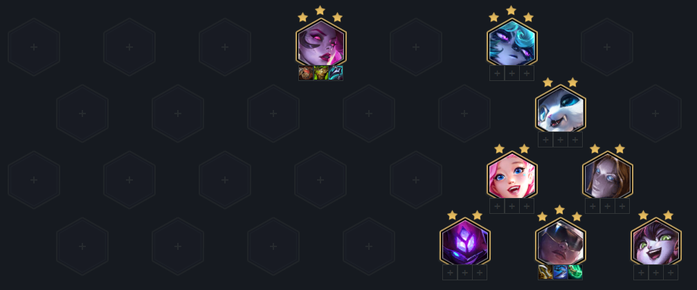 一直赌三星赌到5-4选完秀然后拉8人口,这时候必须要要有一个以上的三星做一次提速挂满羁绊,然后6阶段看情况把其余三星D出来即可,根据三星情况切换莫甘娜或薇古丝为主坦,主C赛纳必须要三星,最完美的情况下就是除了两张四费卡外其余全三星,当然这是非常胡的情况了,通常只需要做到赛纳三星薇古丝三星莫甘娜三星即可,这局因为前期连胜打的非常好而且经济也好D卡也不天谴所以我几乎全追三星了!后续根据对局情况站位左右两边互换即可打刺客的话薇古丝可以单独站在第一排然后把纳尔跟莫甘娜拉下来站在赛纳前面即可!
