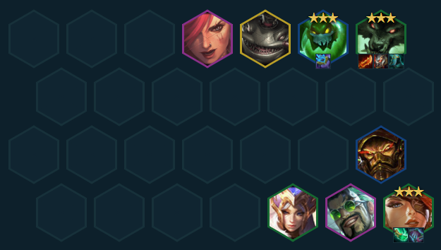 阵容组成:蔚(4)塔姆(5)扎克(3)狼人(2)蛮王(3)猪妹(2)德莱文(4)奎因(2)