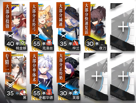 其他干员:执旗手先锋、常规狙击、单体术师、减速辅助、快速复活、单奶