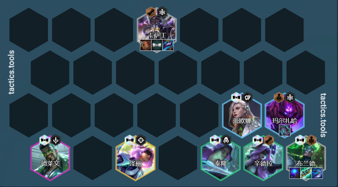阵容组成:火男、卡萨丁、辛德拉、泰隆、雷克赛、马尔扎哈(6人口体系卡牌)