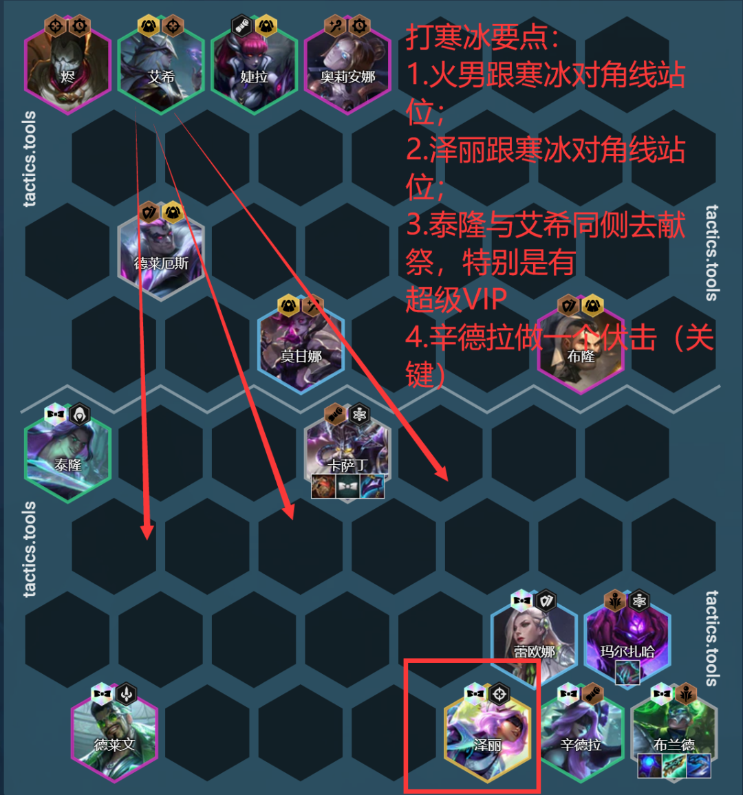 (2)阵容整体站位必须是跟寒冰对角线站位,千万不能同侧,火男是能够吃到寒冰的伤害的;