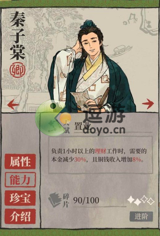 2.天赋能力:置业,负责1小时以上的理财工作时,需要的本金减少10%,且铜钱收入增加4%。