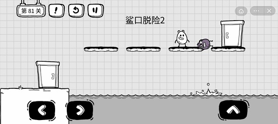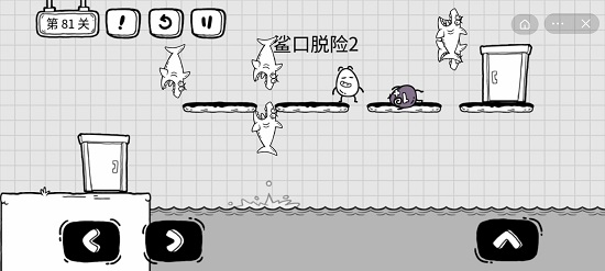 1、操作茶叶蛋躲避张嘴的鲨鱼跳跃到第二个平台上,然后撞击笑脸鲨鱼
