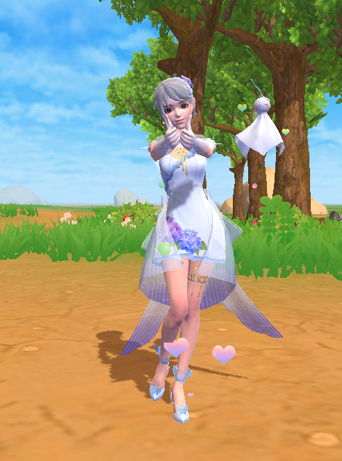 裙角染印着几团错落有致的绣球花,透明薄纱如同清晨的雾般笼罩其上,垂坠逶迤,渐变成梦幻雅致的蓝紫色,彷如晨雾中初醒的精灵,轻盈飘逸,仙气灵动。