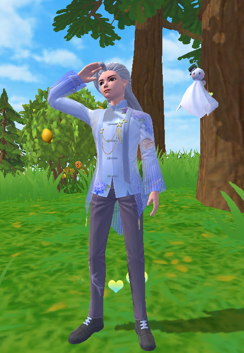 男生长发高束成马尾,刘海斜梳,如同初入江湖的少侠般英气勃勃。上衣选用了渐变的白与紫色,肩膀和衣摆都纹绣着大朵盛开的浅蓝色绣球花,外罩清爽的透明纱织长衫,胸前佩戴的金色珠饰,黑色西装长裤尽显优雅贵气。