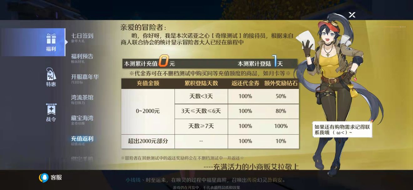 冒险家将根据充值金额以及登录天数领取不同档位的返利,0-2000元部分最高返利100%哟!不过芙芙还是要提醒大家,要理性消费,不能上头哟~
