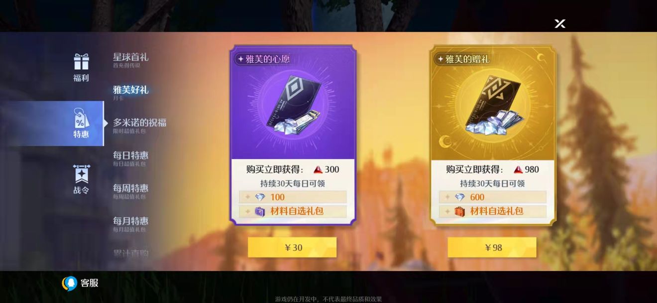 购买对应档位的月卡不仅可以立即获得等值源晶,购买后每日还可领取钻石+材料自选礼包,持续30天。但是!冒险家们必须记住一件事——理性消费,量力而行!
